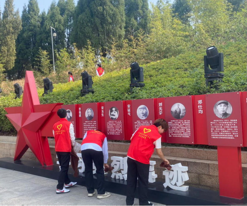 学员们以“红色守护者”的身份展开志愿服务行动。他们手持清洁工具,分组对红星公园内的革命纪念碑、英烈浮雕及周边步道进行细致擦拭与清扫。在劳动过程中,学员们始终保持着庄重的神情,仿佛在与历史对话,以行动诠释对革命先辈的敬意。