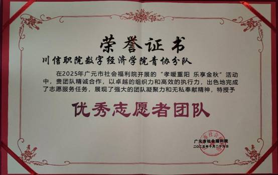 此次志愿活动不仅为老人们带去了欢乐与陪伴,也充分展现了数字经济学院学子的人文关怀与奉献精神。活动尾声,广元市社会福利院为青年志愿者协会颁发“优秀志愿者团队”荣誉证书,以表彰志愿者们的出色表现。参与活动的同学表示:“看到老人们脸上洋溢的笑容,我们深感一切付出都是值得的。未来我们将继续投身公益,用青春力量传递温暖,让志愿精神薪火相传。”